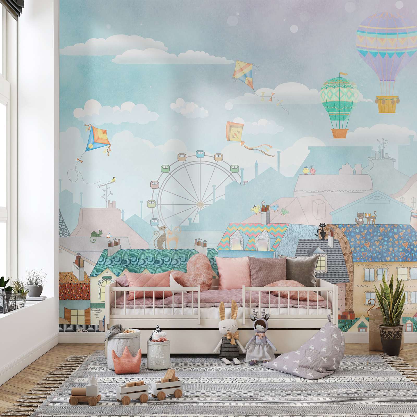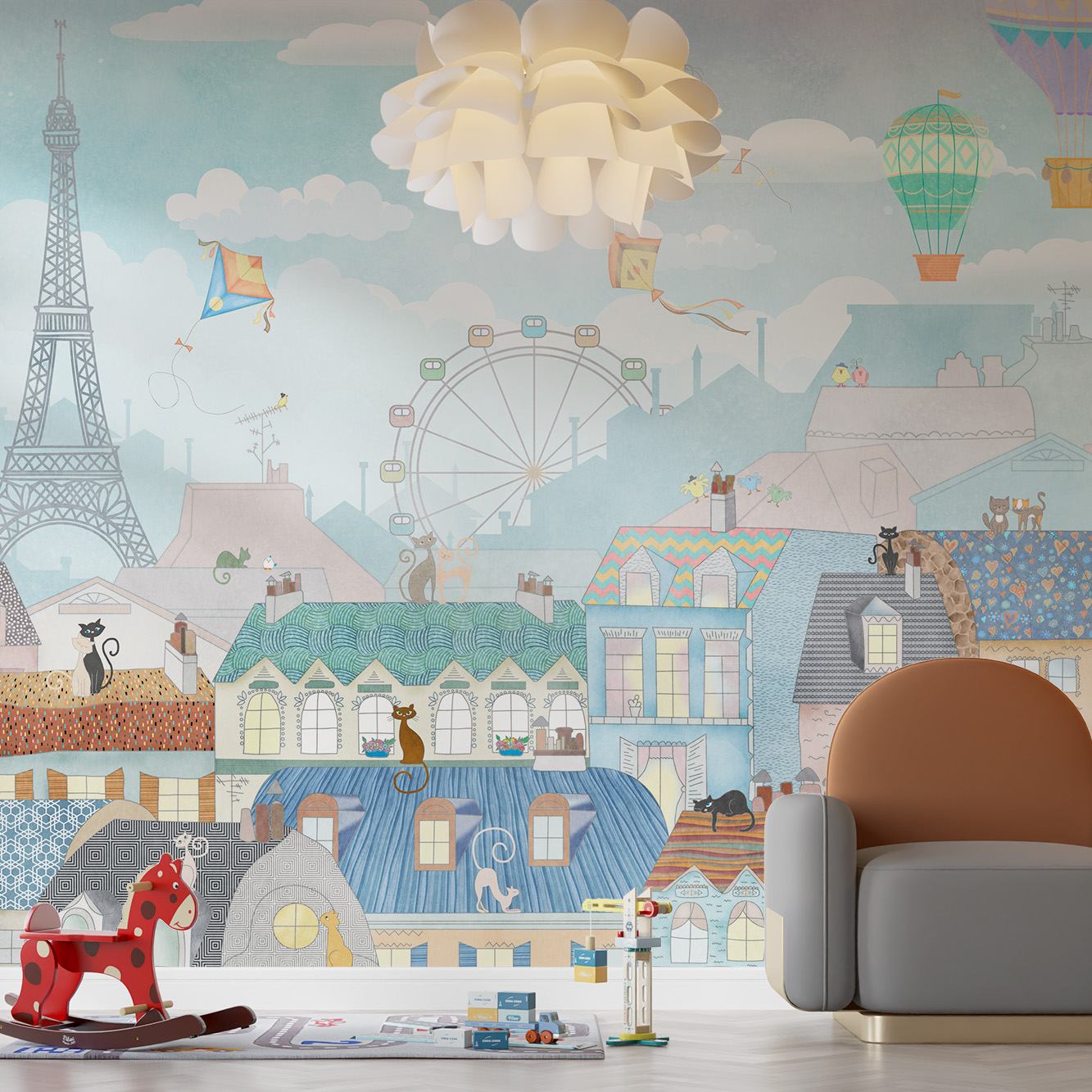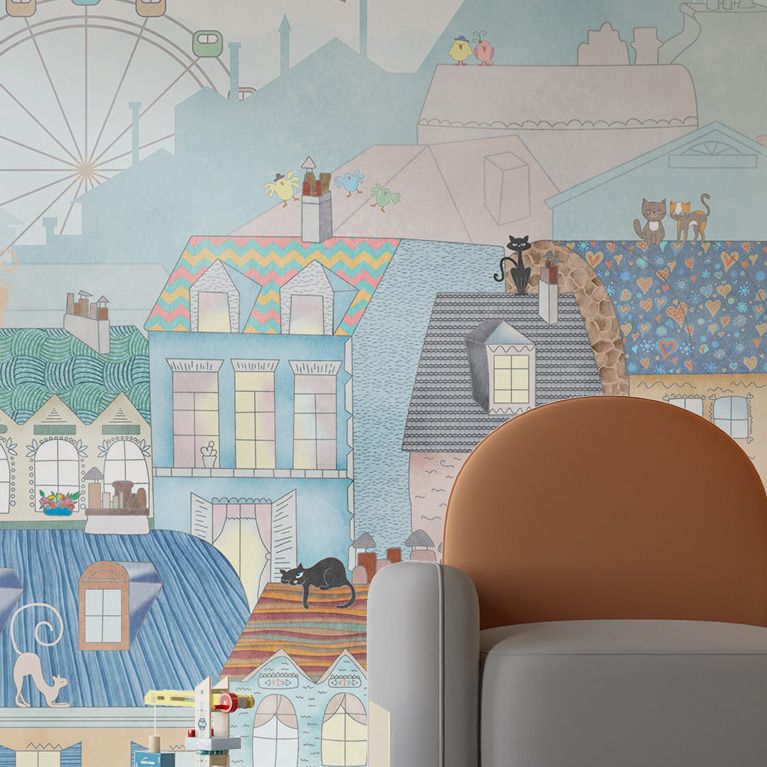 Dit behang heeft een fantasierijke weergave van een fantasie-stadsgezicht geïnspireerd op Parijs, compleet met heteluchtballonnen, vliegers en charmante daken. Ideaal om elke kamer een vleugje speelse elegantie te geven, het brengt een gevoel van avontuur en charme. Een perfecte keuze voor kinderkamers of creatieve ruimtes.