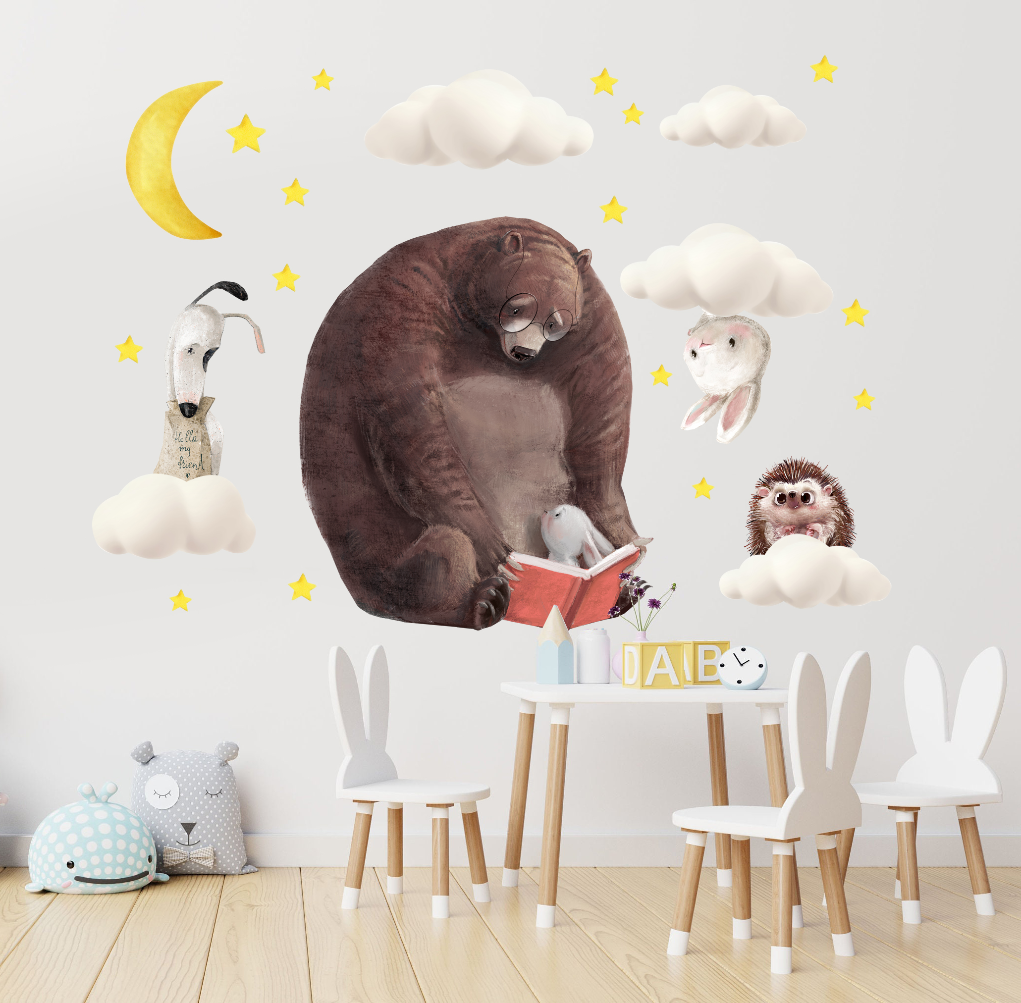Onze muurstickers zijn niet alleen voor de schoonheid, ze zijn op zichzelf een speeltuin. Ze nodigen kinderen uit om te interacteren, hun eigen verhalen en avonturen te creëren. Bij elke muursticker hoort een verhaal waar kinderen op kunnen voortbouwen, en de kamer wordt een deel van het spel.