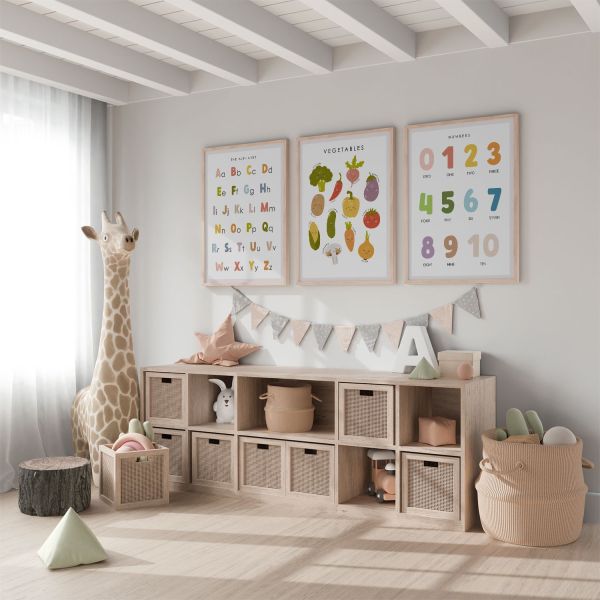 Verlevendig de kinderkamer met deze levendige posterset met alfabetten, nummers en groenten. Elk poster is ontworpen om te engageren en te educeren met kleurrijke illustraties. Tekst is inclusief: 'THE ALPHABET', 'NUMBERS', en 'VEGETABLES'. Product bevat een set van 3 posters alleen.